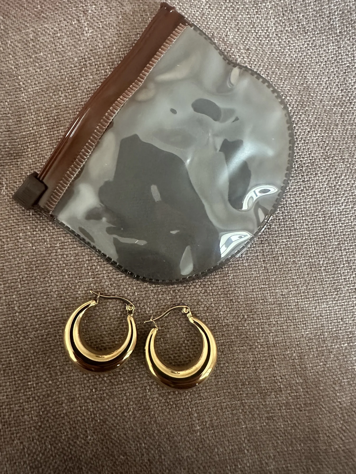 Close-up of a person wearing gold hoop earrings with a neutral background