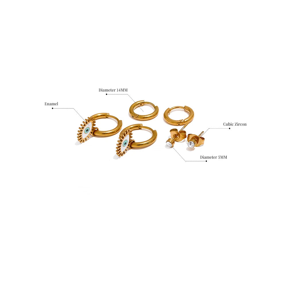 Elevate your everyday style with this versatile 3-piece evil eye earring set featuring protective symbolism and modern design. This curated collection includes delicate studs and huggie hoops adorned with enamel evil eye details, perfect for mixing, matching, and layering. Create endless looks with this essential set that brings both meaning and style to your jewelry collection.