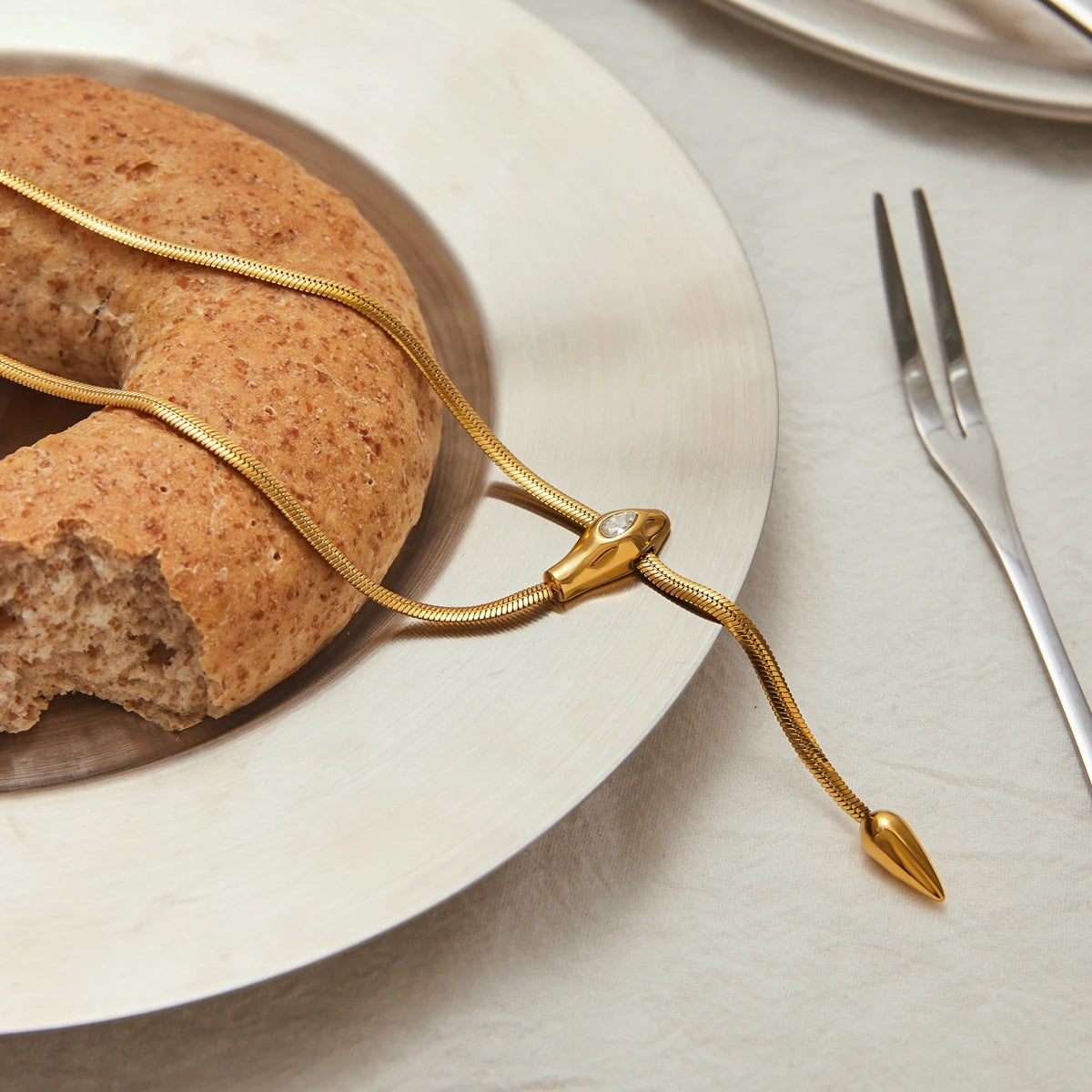 Embrace bold sophistication with this striking snake pendant necklace featuring sparkling gemstone accents. The serpent design symbolizes transformation and wisdom, creating an edgy yet elegant statement piece. Perfect for those who appreciate meaningful jewelry with distinctive character and modern mystique.