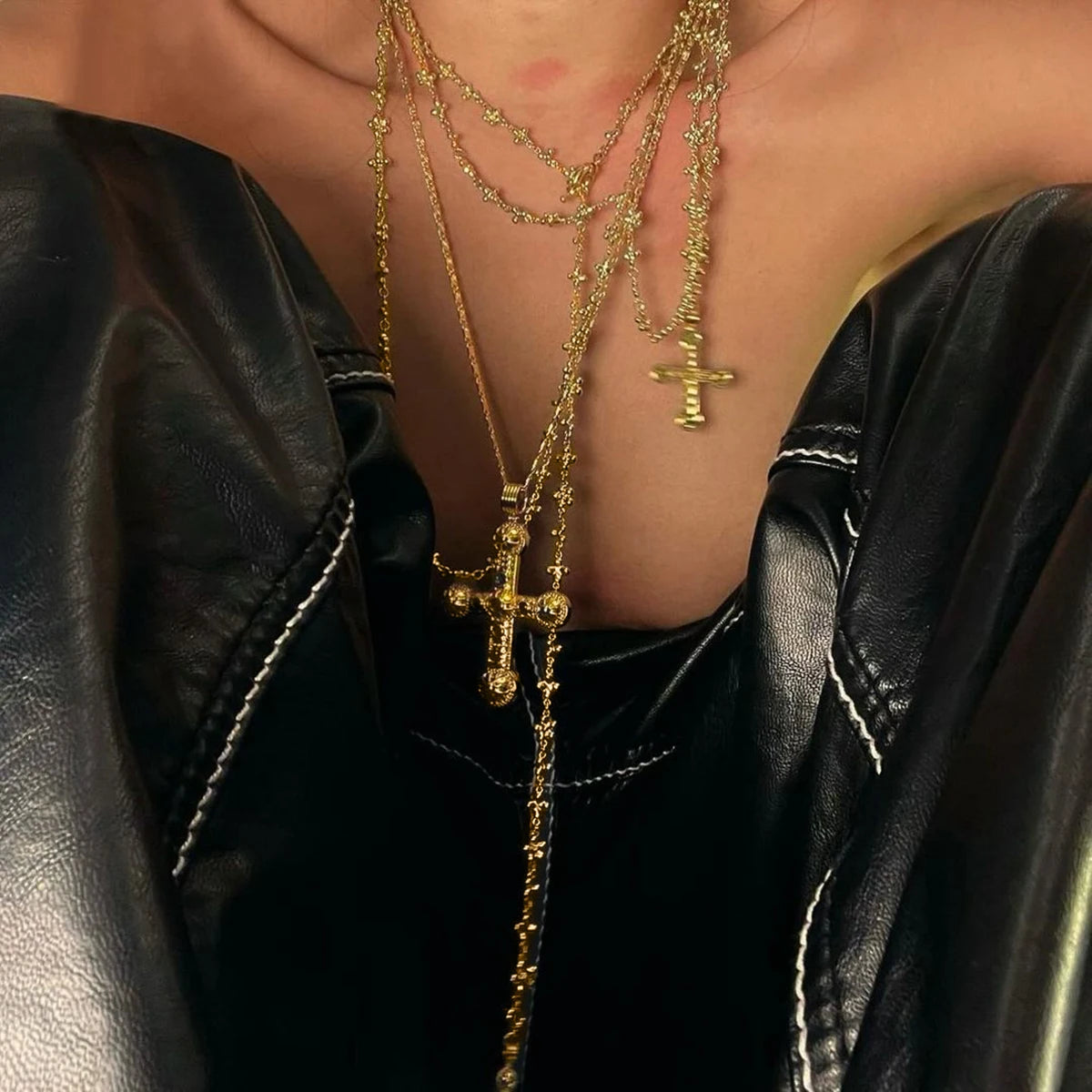 Gold necklaces on a person wearing a white outfit with a blurred background