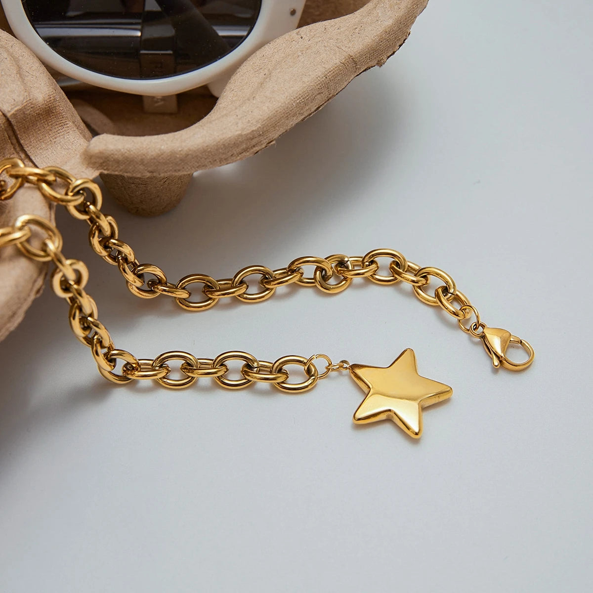 Woman wearing a gold chain necklace with a star pendant against a light blue background