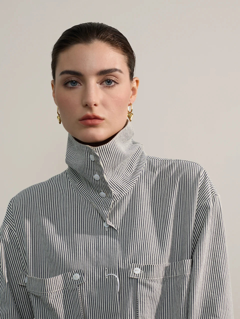 Woman in striped shirt wearing Yhpup stainless steel heart hoop earrings