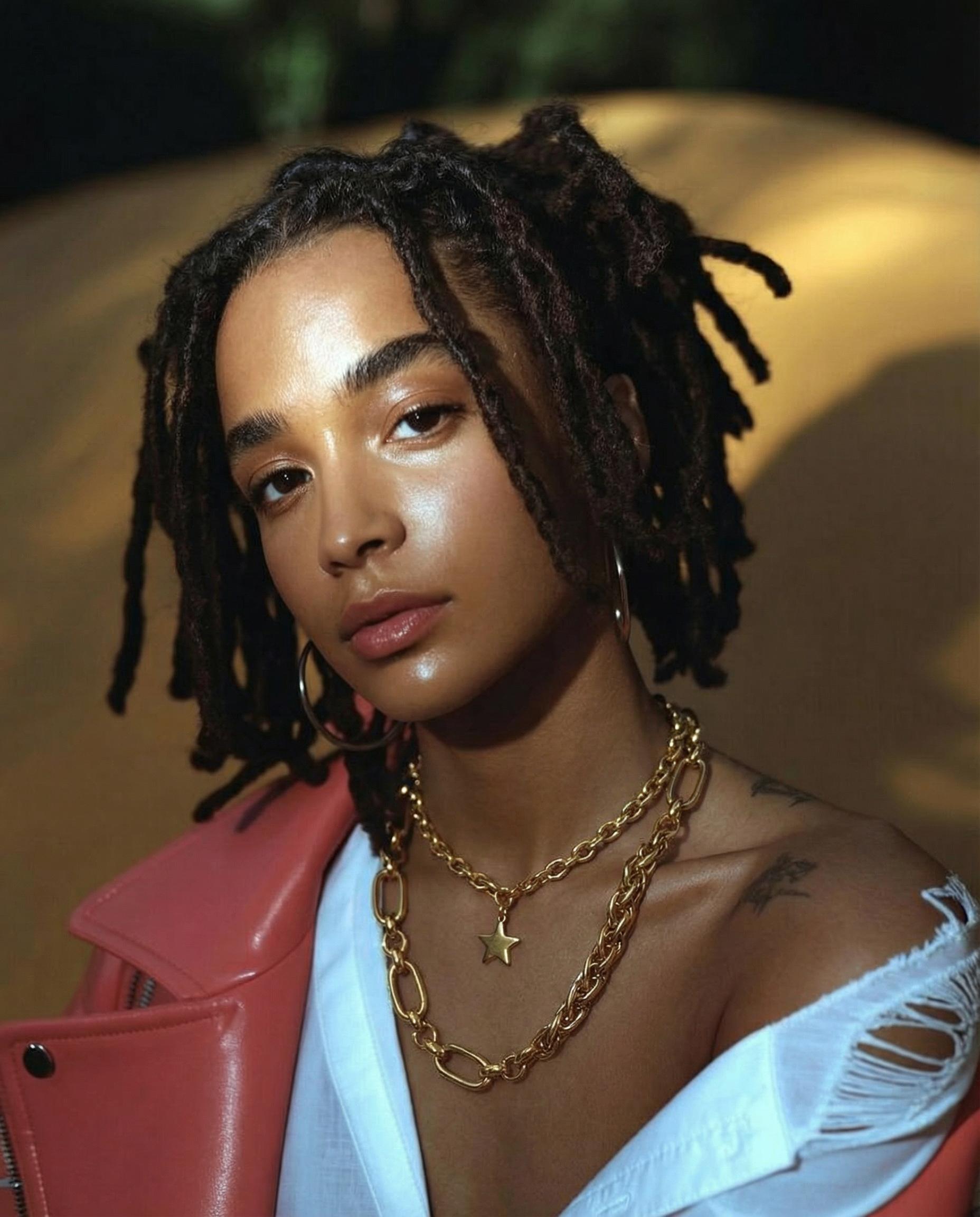 Woman wearing a gold chain necklace with a star pendant against a light blue background