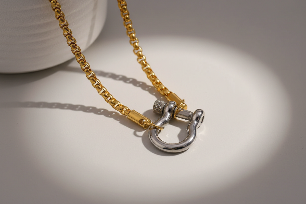 This two-tone lock pendant necklace combines modern elegance with symbolic meaning. Featuring a sleek gold chain with a striking silver lock pendant, it's a versatile piece that represents security, commitment, and personal strength. The mixed metal design adds dimension and sophistication to any outfit, making it perfect for layering or wearing solo.