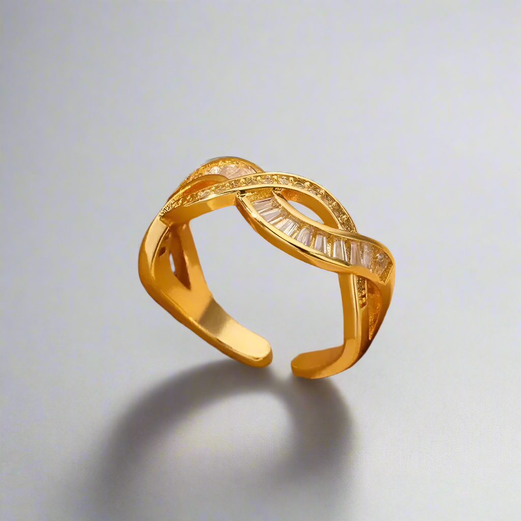 This gold-plated adjustable ring blends elegance and sparkle with its intertwined design and sparkling stones. It adds a luxurious touch to any outfit, and its adjustable fit ensures a comfortable fit. Made to last, it continues to shine day after day.