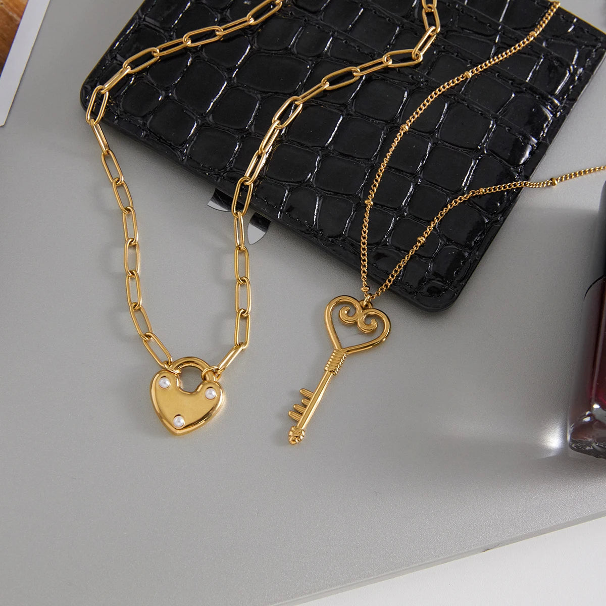 This romantic necklace set tells a beautiful story of connection with its complementary lock and key pendants. Perfect for sharing with someone special or layering together, these delicate necklaces symbolize the bond between two hearts and add meaningful elegance to any look.